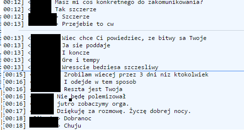 Rozmowa sikoreczki z inim, niestety byłem głupi i zacenzurowałem loga choć jak sie uprzecie to znajde oryginał