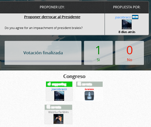 The second module is a politics. Just like in real life politics in E-Sim are an extremely powerful tool that can be used for your own purposes. From time to time there are elections in the game in which you will not only vote, but also have the ability to run for the head of the party you're in. You can also apply for congress, where once elected you will be given the right to vote on laws proposed by your fellow congress members or your president and propose laws yourself. Voting on laws is important for your country as it can shape the lives of those around you. You can also try to become the head of a given party, and even take part in presidential elections and decide on the shape of the foreign policy of a given state (for example, who to declare war on). Career in politics is obviously not easy and in order to succeed in it, you have to have a good plan and compete for the votes of voters.